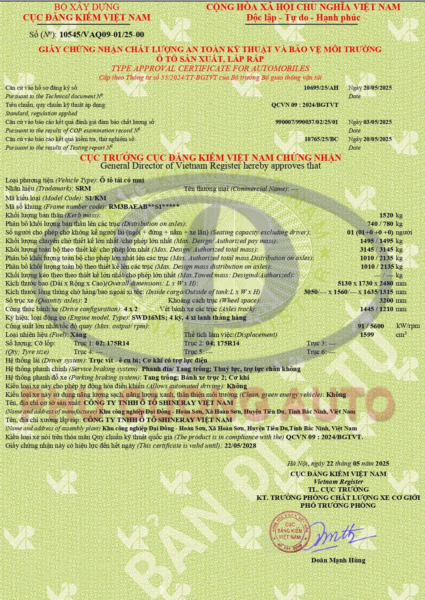 Chassis (Sát xi): Được dập nguyên khối từ thép chuyên dụng, có độ dày cao để tương thích với cấu hình nhíp trước/sau và tải trọng 1.5 tấn.